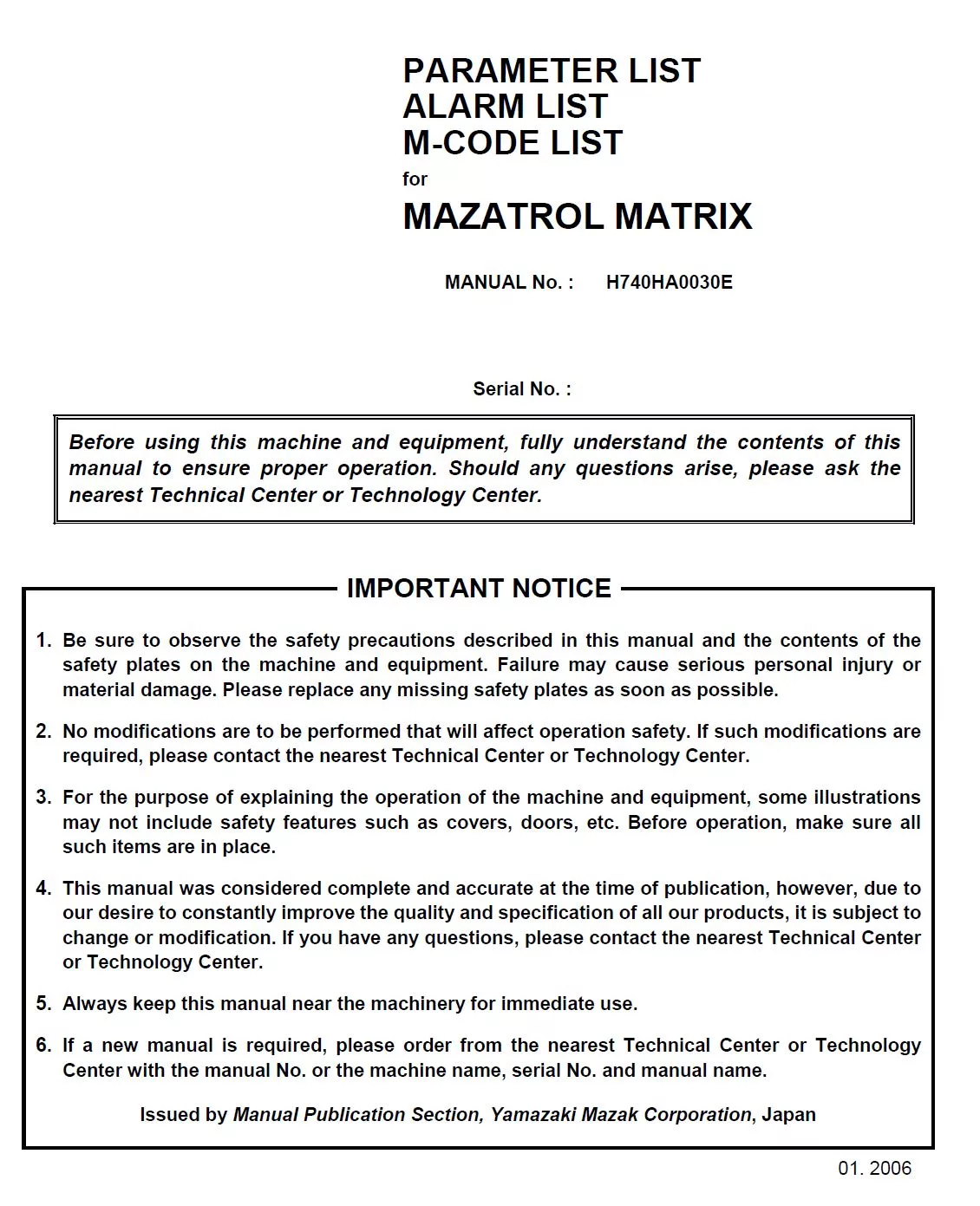 This is a downloadabl manual for the Mazak Mazatrol Matrix controls. Manual includes detailed descriptions of parameters and alarm codes